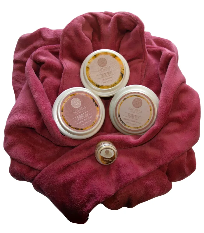 Soft fleece gown gift set includes Matsimela bath salts, body butter, bath scrub and lip balm.